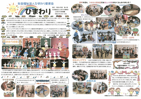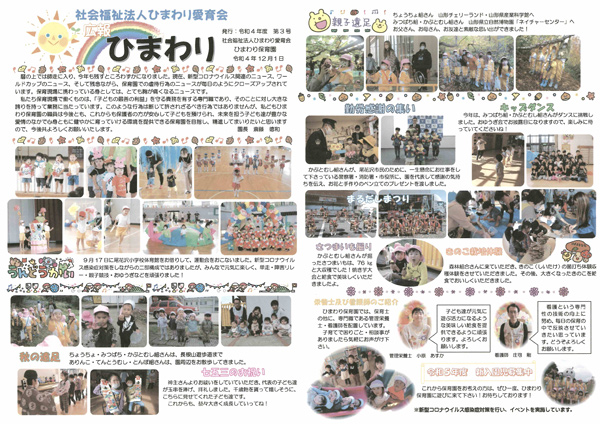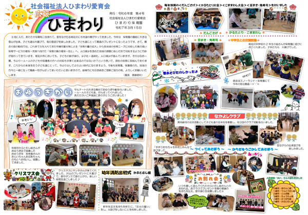 異常なまでの暑さに悩まされた夏、これまでにない積雪の冬と異常気象ともいえる一年もまもなく4月からの新しい年度を迎えようとしています。今年一年ひまわり保育園の子ども達、保護者の皆様方、そして支えて下さった地域の皆様方には、心より感謝申し上げます。